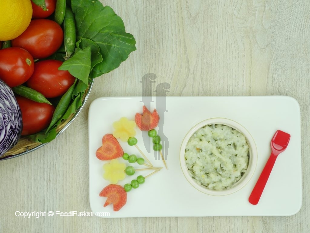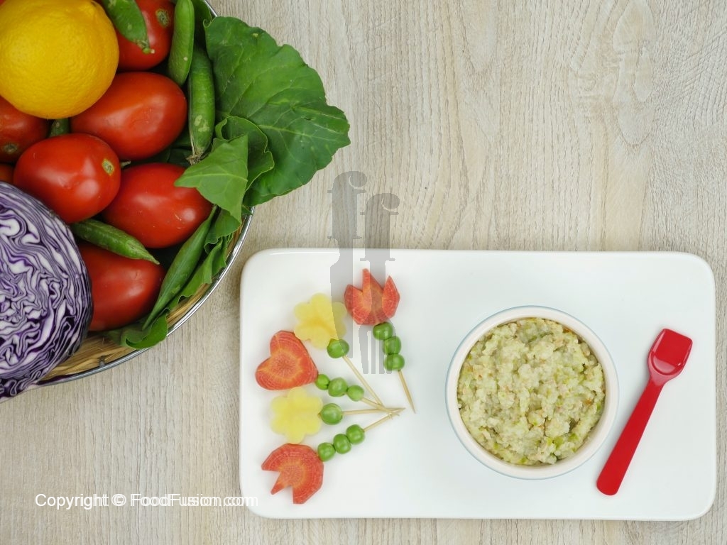 Add water,rice,peas,tomato and mix well,bring it to boil,cover & steam cook until desired consistency (15 minutes).