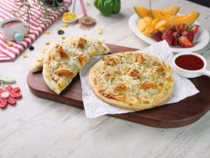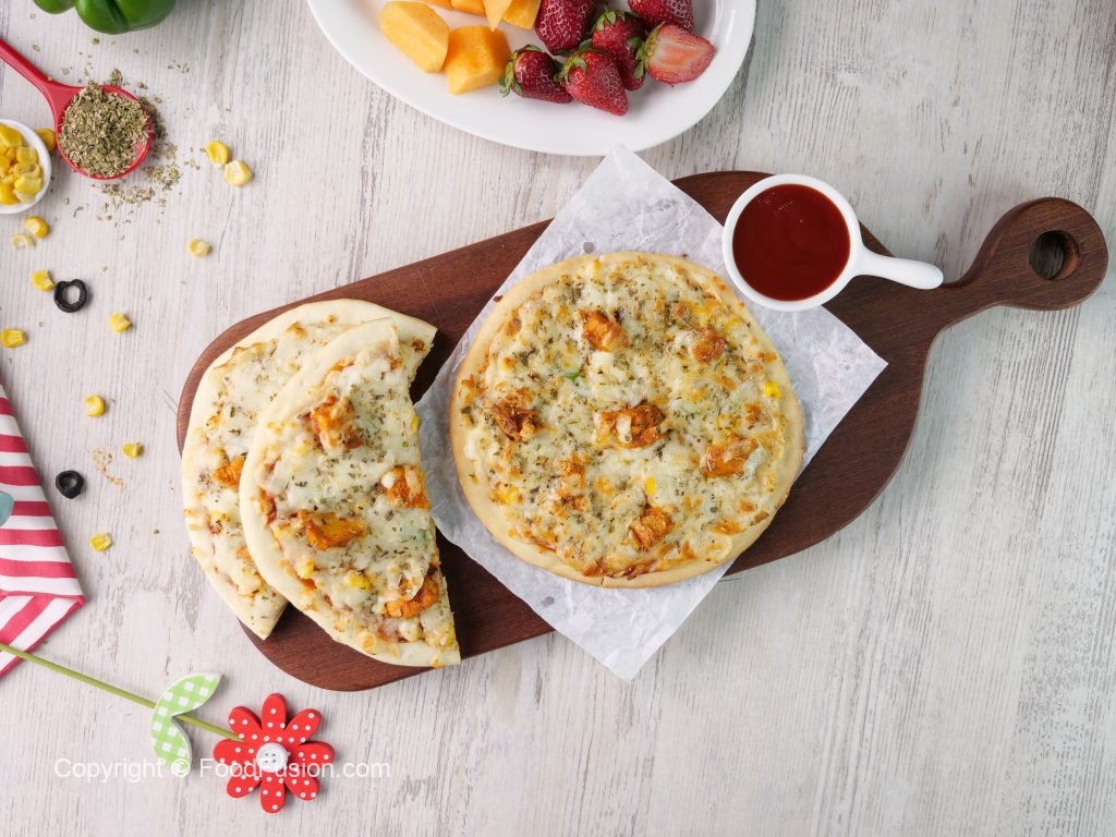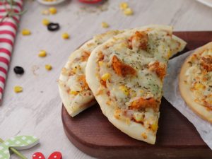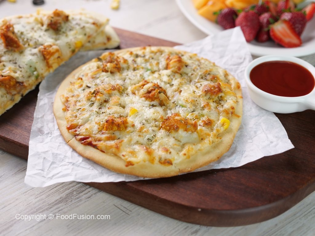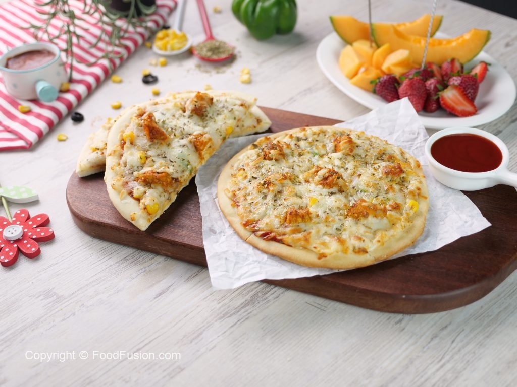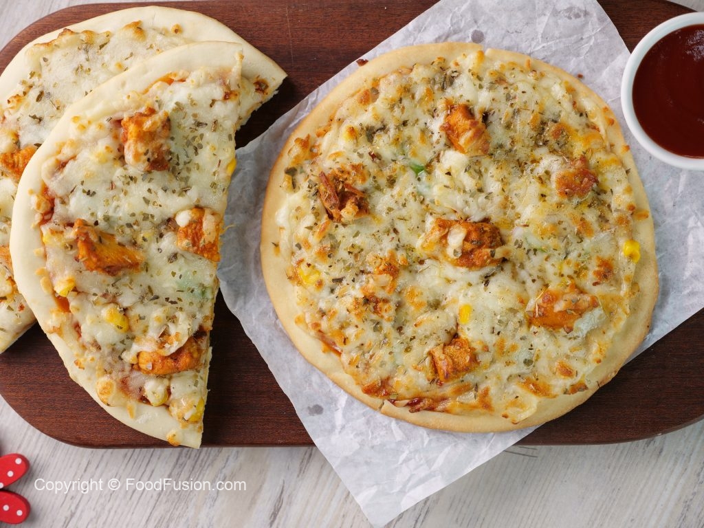 -Pita/shawarma bread per pizza sauce dal ker pheela lein,cooked chicken topping,shimla mirch,corn kernels,pyaz,cheddar cheese,mozzarella cheese & dried oregano dal dein.