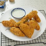 -Stuff green chillies with prepared pickle mixture then dip in prepared pakora batter & coat with nimco sev.