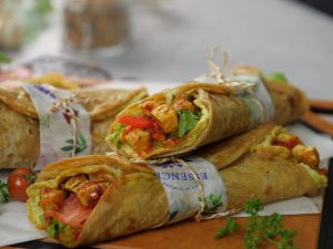 -Add & spread prepared chana dahi sauce,add chicken filling,tomato,salad leaves & fold both sides.