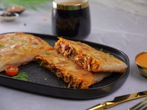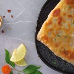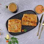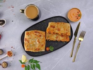-Add 2 tbs of whisked eggs,onion,fresh coriander,green chilli,cheddar cheese slice & fold all sides of dough,apply whisked eggs & seal properly.