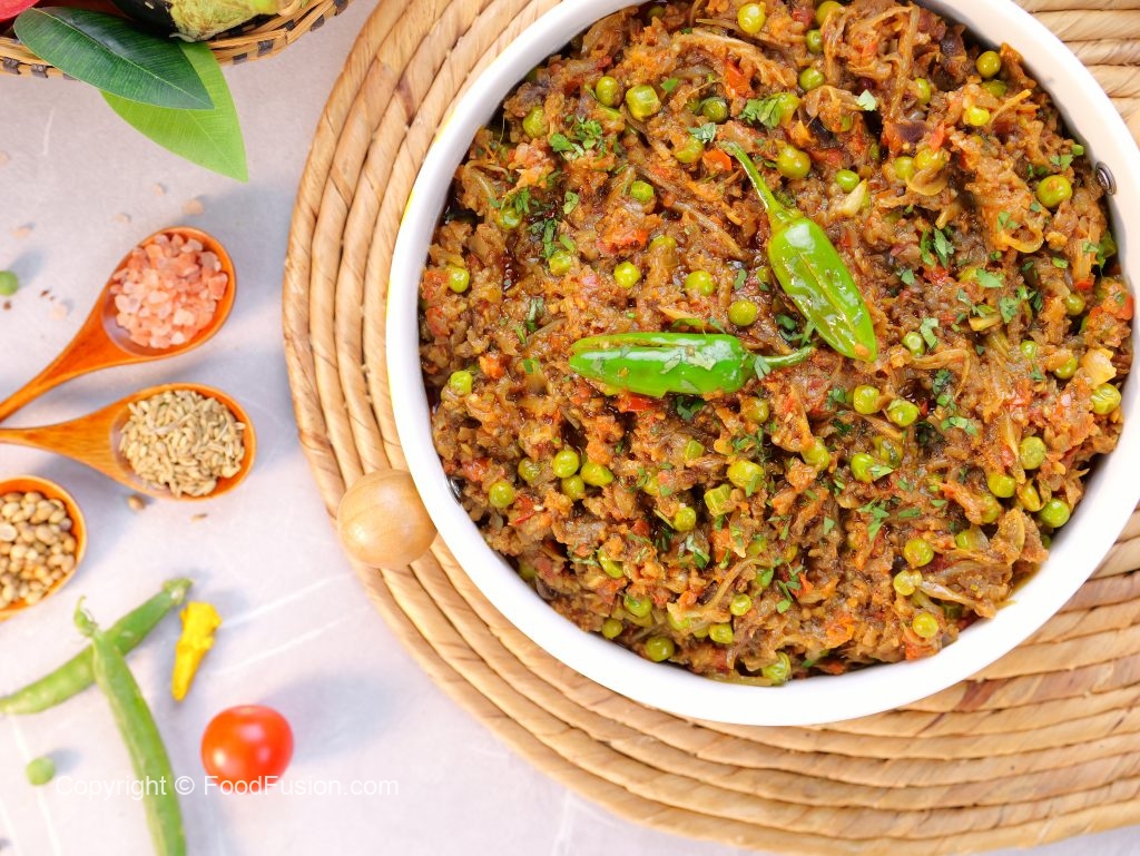 -Hari mirch,grated baingan,matar,pink salt,haldi powder,sabut dhania,lal mirch powder,zeera,Kashmiri lal mirch powder aur saunf dal ker ache tarhan mix ker lein.