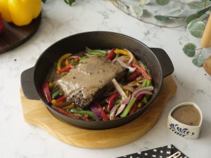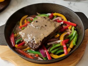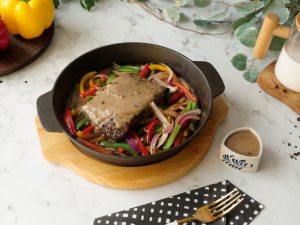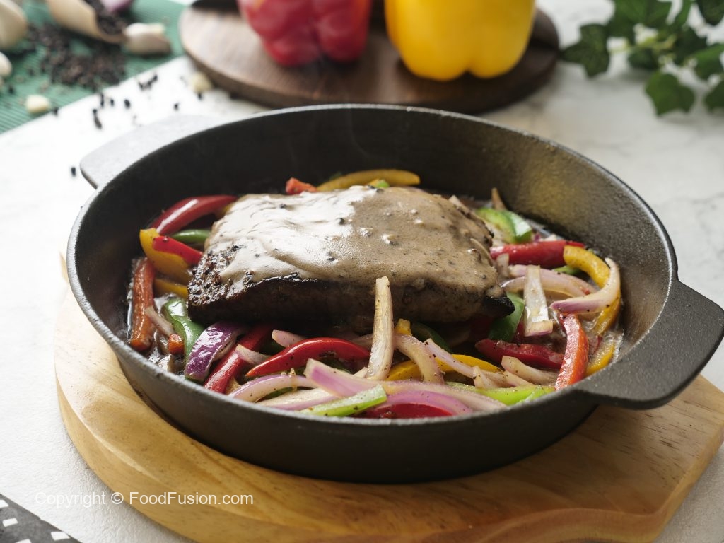Stir fried vegetables aur beef steak rakh dein aur upper sa peppercorn sauce dal ker serve karein!
