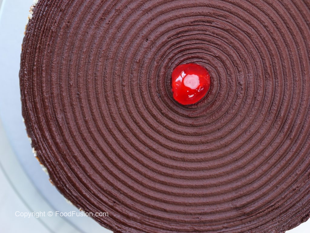 -Place another layer of cake,add sugar syrup,add prepared chocolate frosting & cover the sides of the cake with frosting.