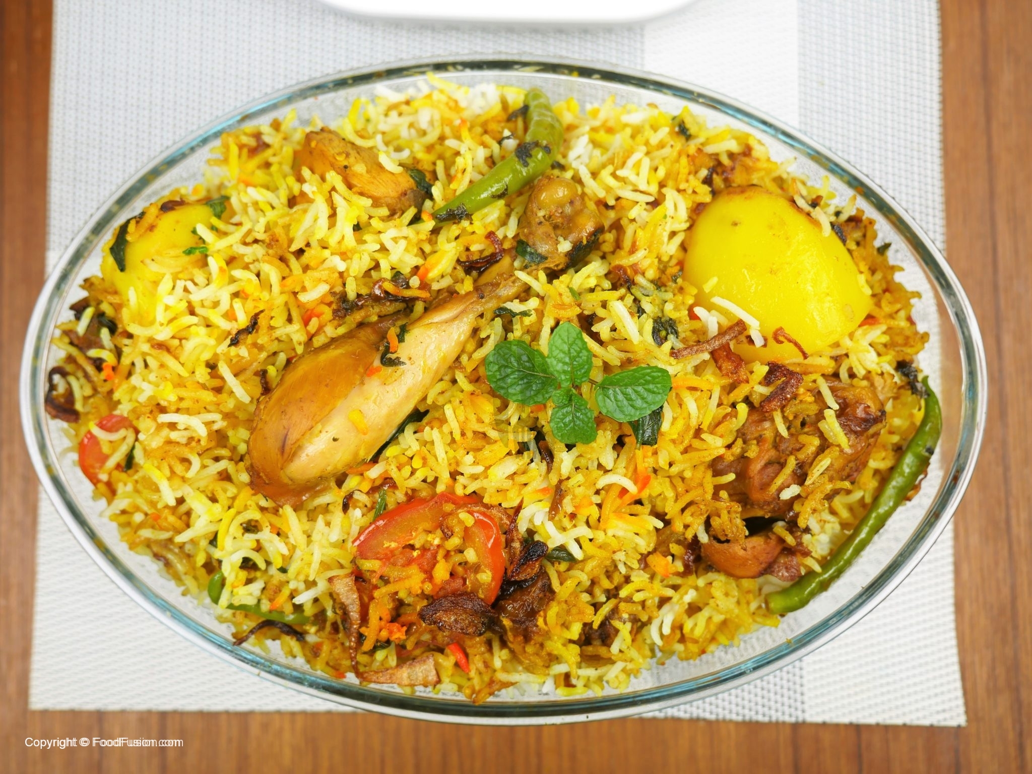 Gravy mein pyaz (fried),tamatar (sliced),podina,hara dhania,hari mirch,dahi,zarde ka rang,chawal boiled,zarde ka rang,pyaz (fried),podina,hara dhania,aalo(boiled) dal ker dhak dein aur 15 minute kliya halki ancch per paka lein.