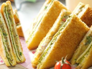 -On toasted sour bread slice,add melted chicken & cheese & top with another bread slice to make a sandwich (makes 4-5 sandwiches).