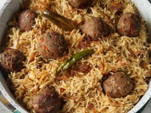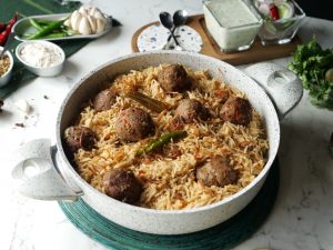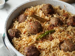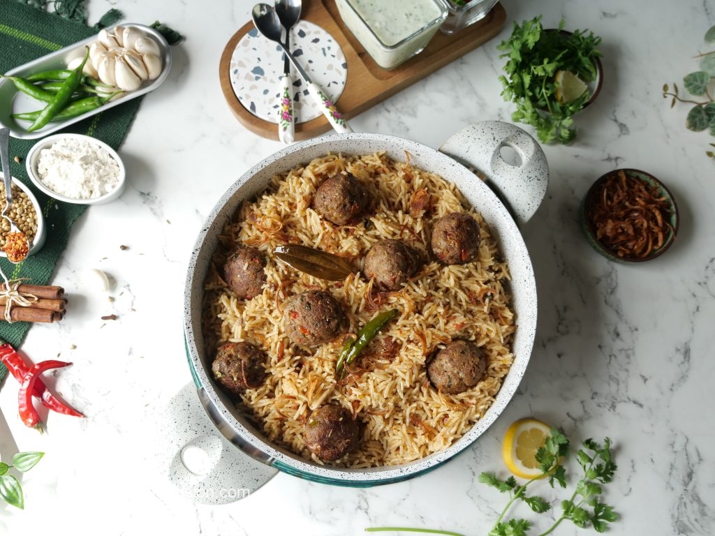 -Add fried chapli koftay,green chillies,fresh coriander & fried onion,cover with aluminum foil & seal with lid and cook on high flame for 2-3 minutes to build up steam then steam cook on low flame for 12-15 minutes.