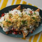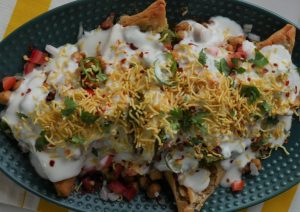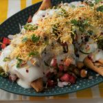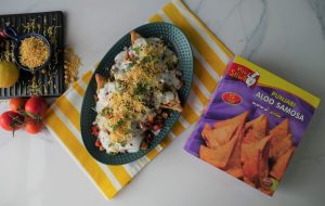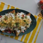 In serving dish,add fried samosa and crush slightly,add cooked chickpeas,onion,tomato,green chili,chaat masala,red chili crushed,lemon juice,green chutney,yogurt,nimco sev,fresh coriander,red chili crushed & serve!