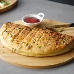 Apply prepared garlic herbed butter & make cuts on it with the help of dough cutter,sprinkle red chilli crushed & dried oregano (Makes 2).