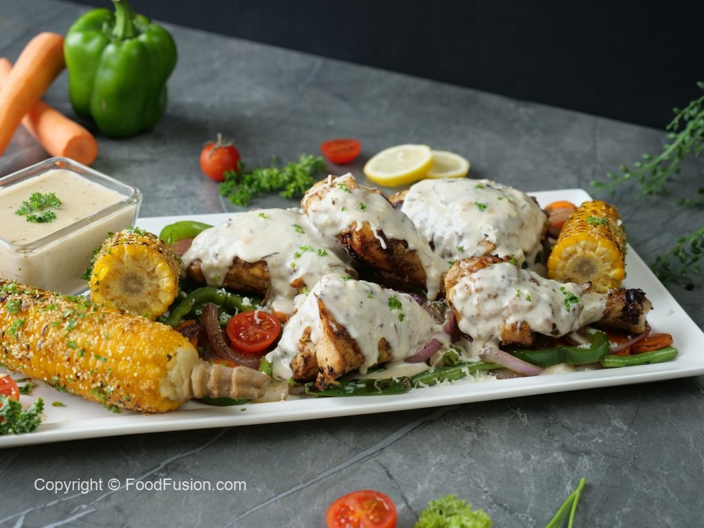 -Serving platter per grilled vegetables,chicken tikka pieces aur grilled corns rakh dein.