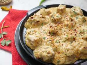 -Add tandoori masala,coriander seeds,cumin seeds,chaat masala,red chilli crushed,salt,all-purpose flour,fresh coriander,green chilli & mix to coat evenly.