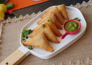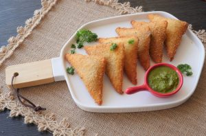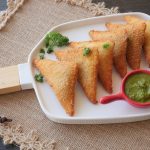 Pani laga lein,cheese slice aur tayyar chicken filling (1 tbs) rakh dein aur fold ker ka triangle shape bana lein aur edges ko press ker ka properly seal ker lein (makes 20-22).