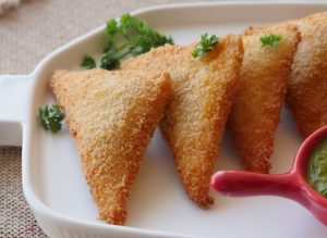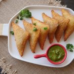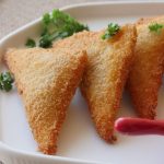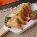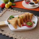 Brush water,place cheese slice,add prepared chicken filling (1 tbs),fold to make a triangle shape,press and seal the edges properly (makes 20-22).