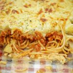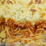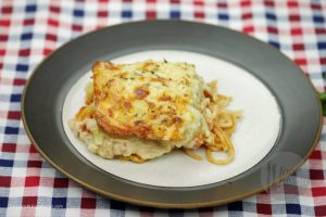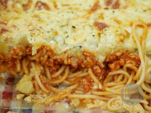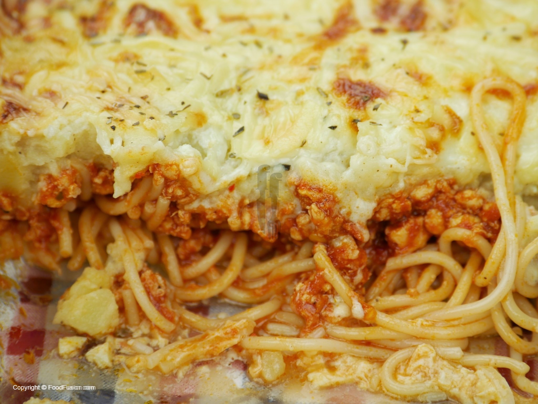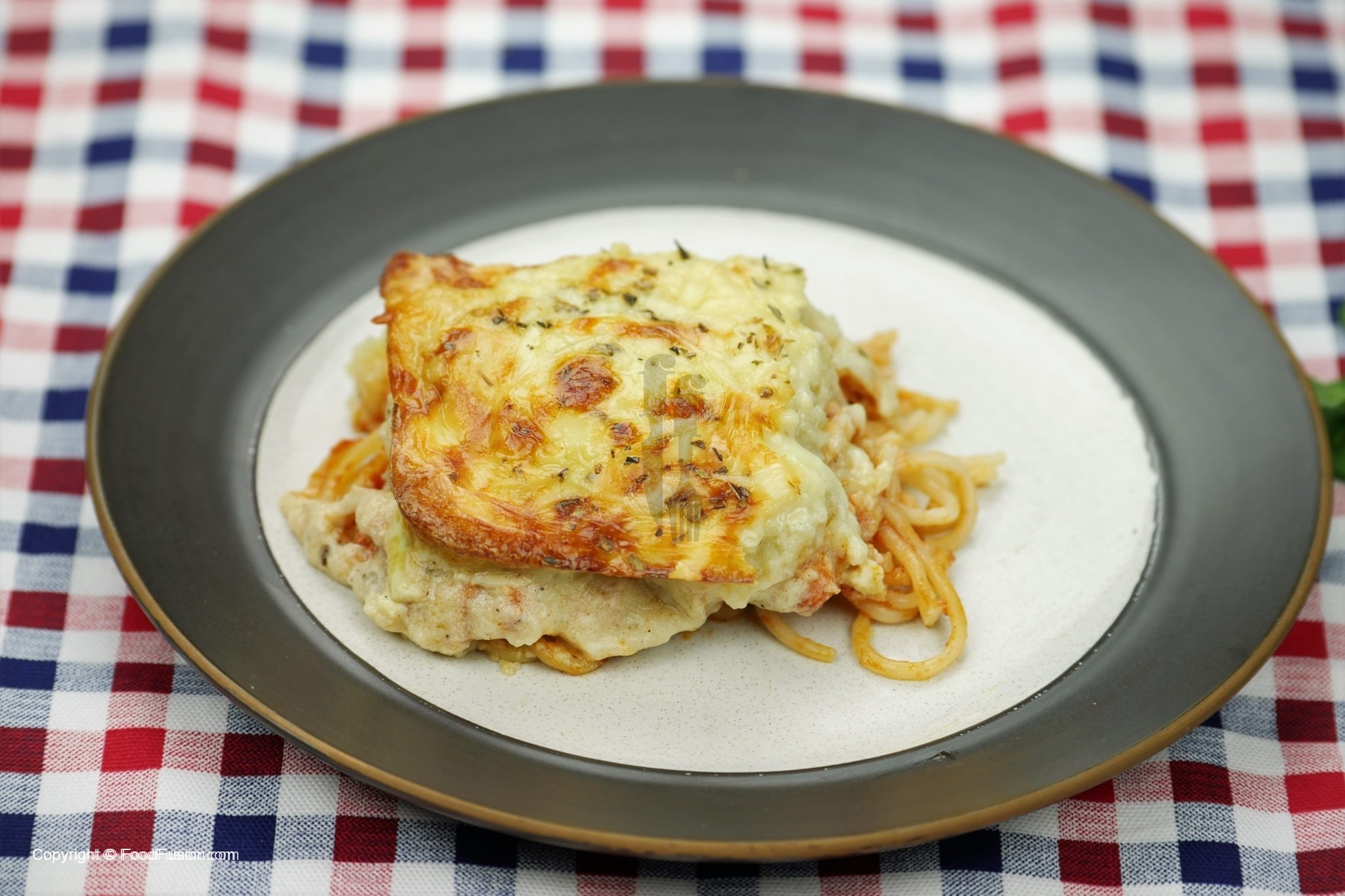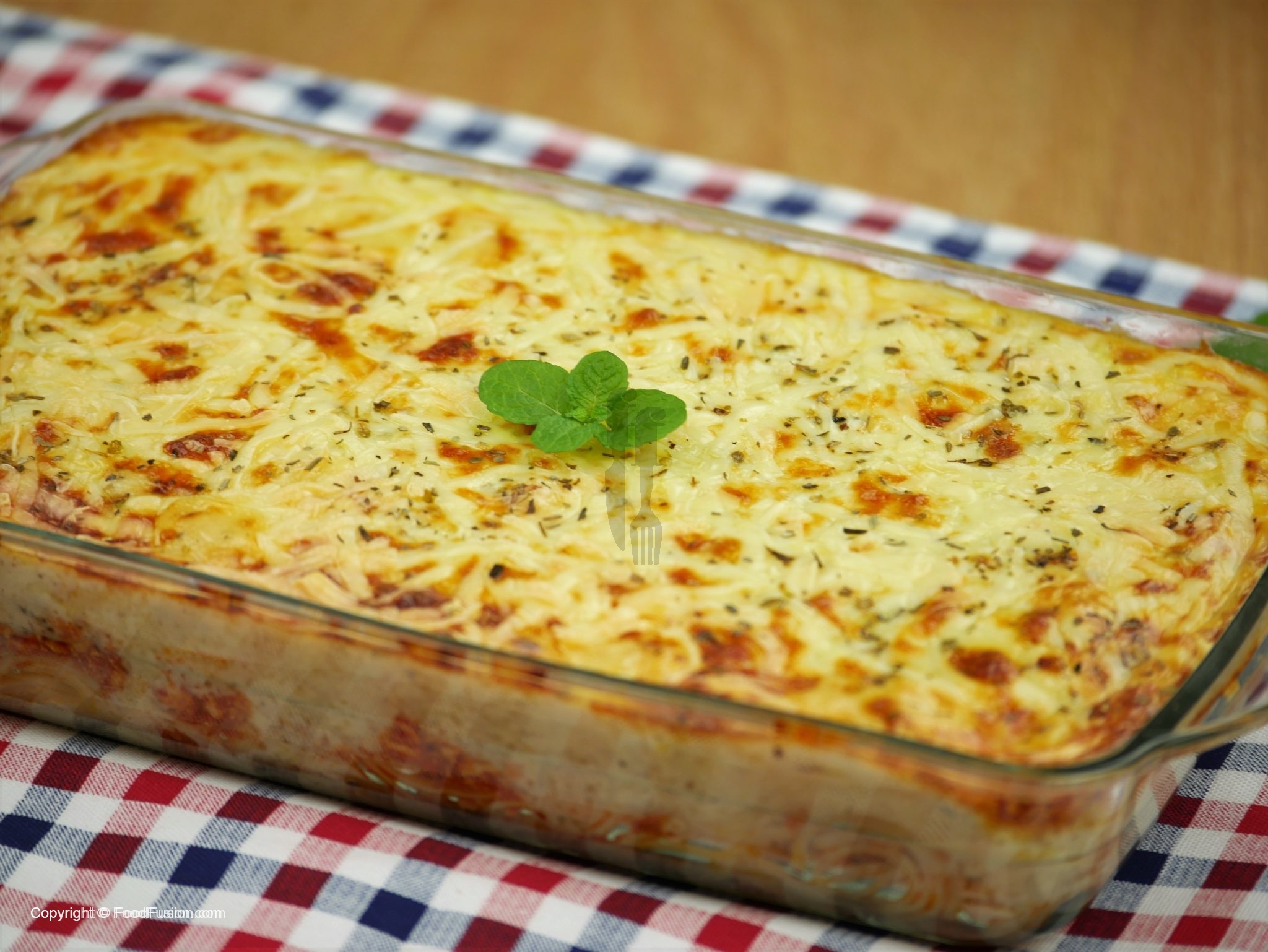 Grease baking dish with butter,add boiled spaghetti,chicken fiiling,white sauce,beaten eggs,mash potato, mozzarella cheese,cheddar cheese and sprinkle oregano.