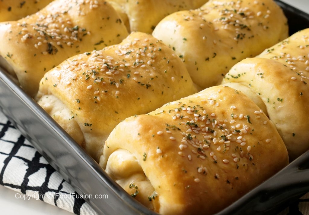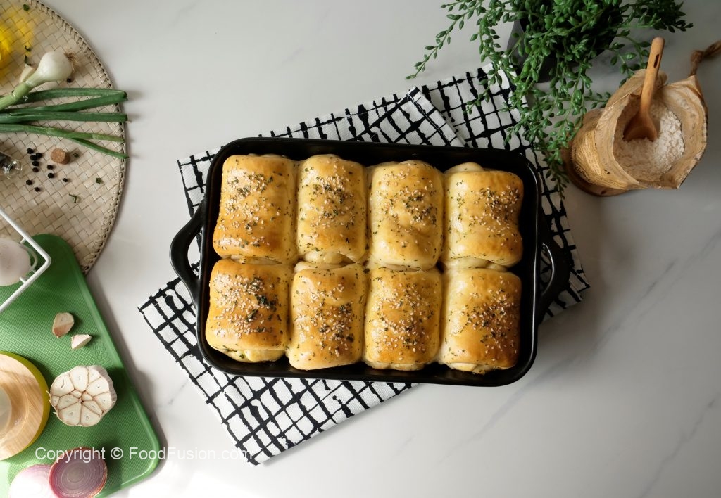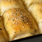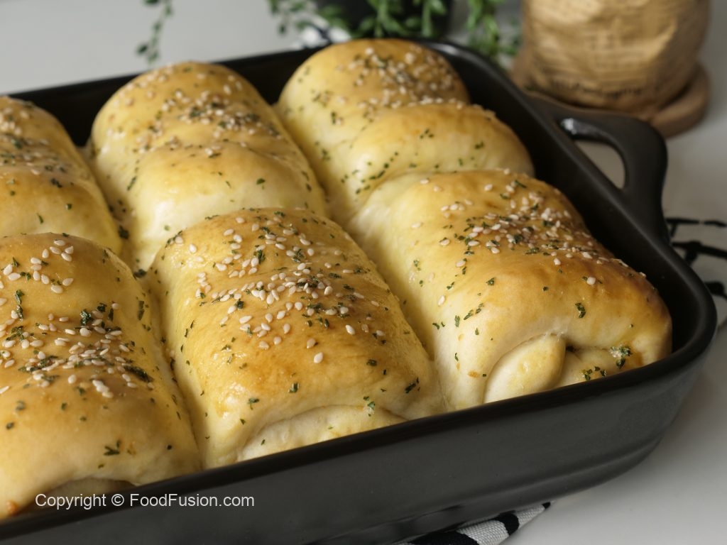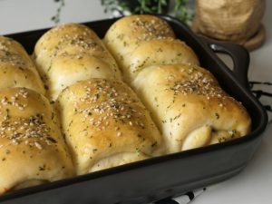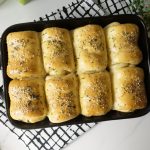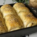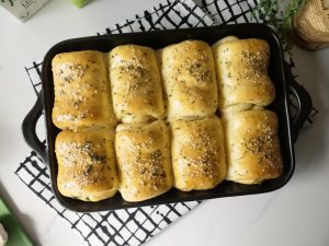 Grease 7.5 x 11” baking pan with prepared herbed butter,place dinner rolls and cover & let it proof for 20-25 minutes.