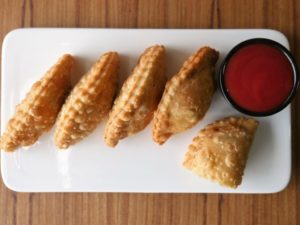 Take a dough,add chicken filling and mozzarella cheese,apply water at the edges,fold it and press and seal the edges with cookie cutter.