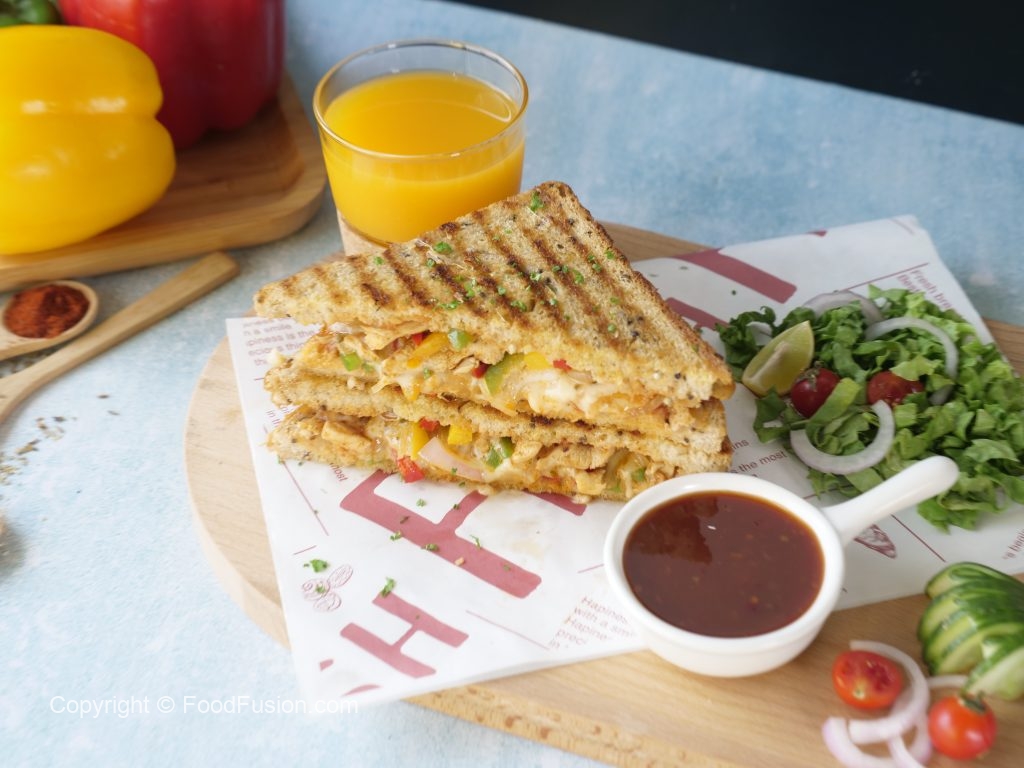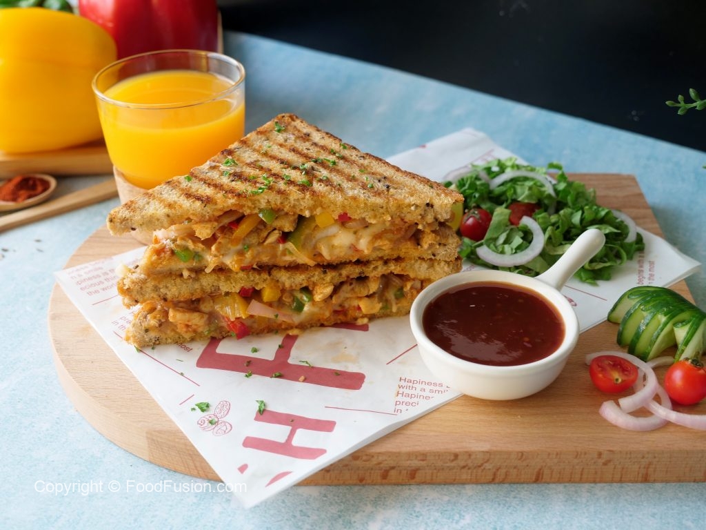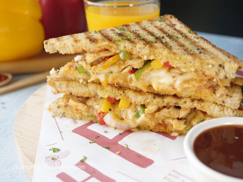 On both bread slices,drizzle tomato ketchup and add prepared chicken fajita filling on one bread slice.