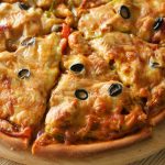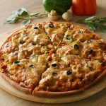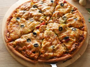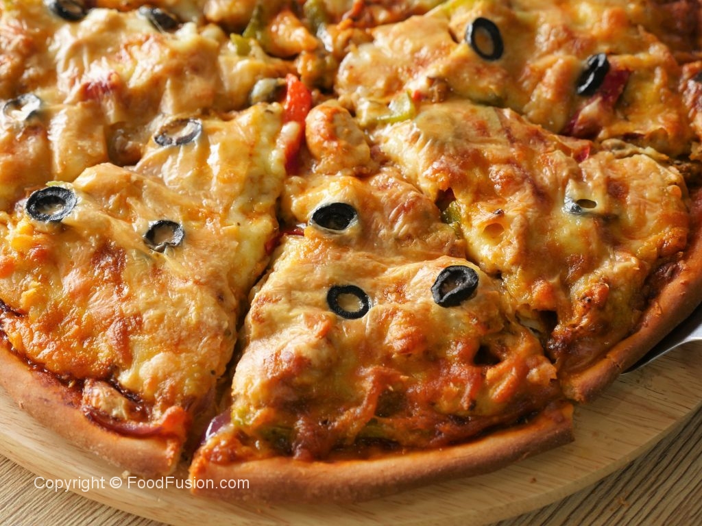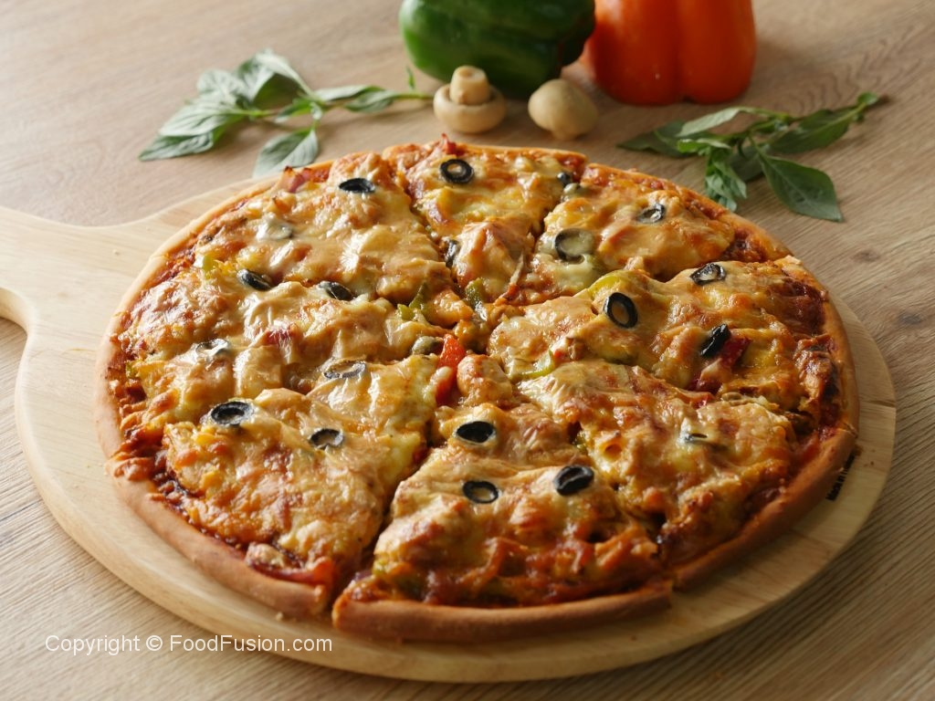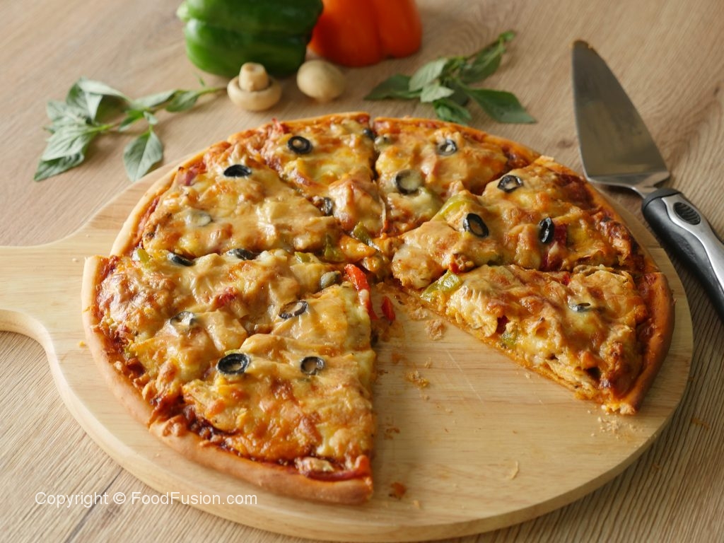Pizza sauce dal ker pheela lein,cooked chicken filling,mozzarella cheese,cheddar cheese aur black olives dal dein (makes 2 regular pizzas).