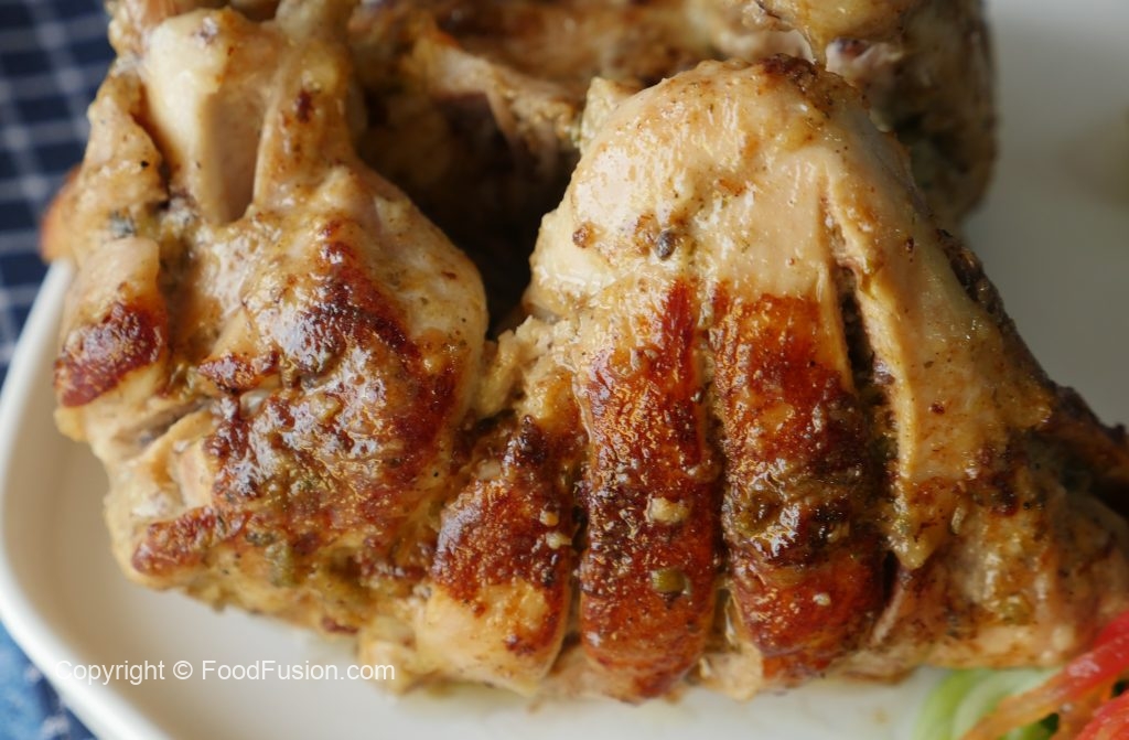 In frying pan,add cooking oil and marinated chicken pieces,cover and cook on low flame 20-25 minutes and keep turning sides in between.