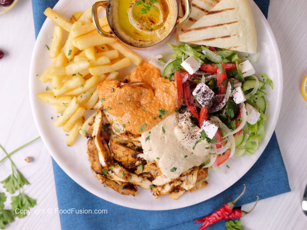 -On serving plate,add hummus,iceberg lettuce,salad,poatao fries,shawarma chicken slices,feta cheese,white sauce,red sauce,lemon juice,sumac powder,fresh parsley,pita bread & serve!