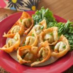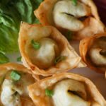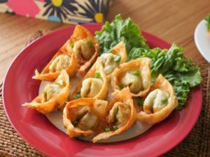 Apply egg on one side of triangle and overlap to form wonton shape (makes 25-30).