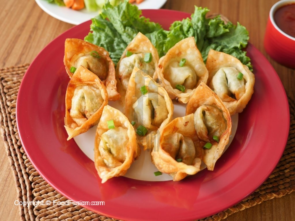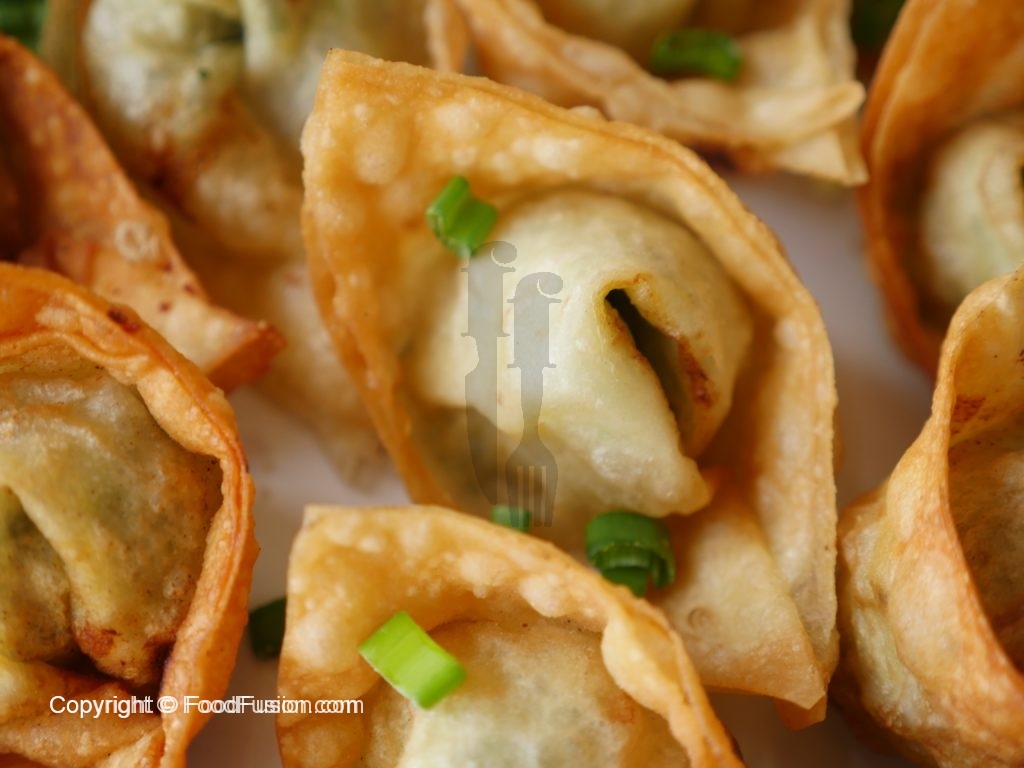 Triangle ka ek side per anda laga lein aur overlap ker ka wonton ki shape bana lein (makes 25-30).