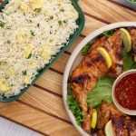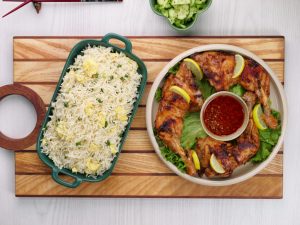 -Serve chicken tikka with egg fried rice.