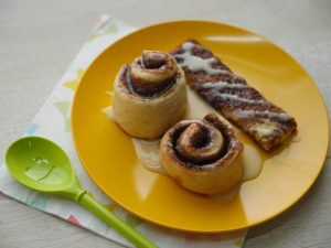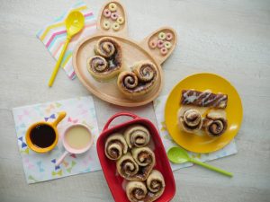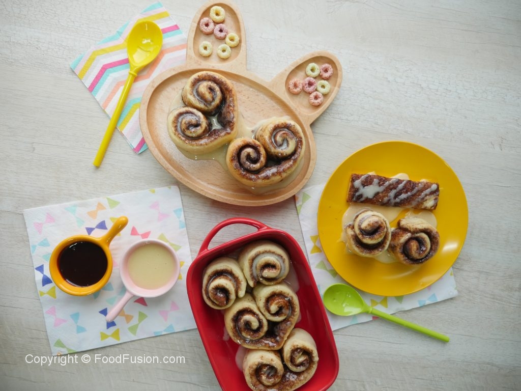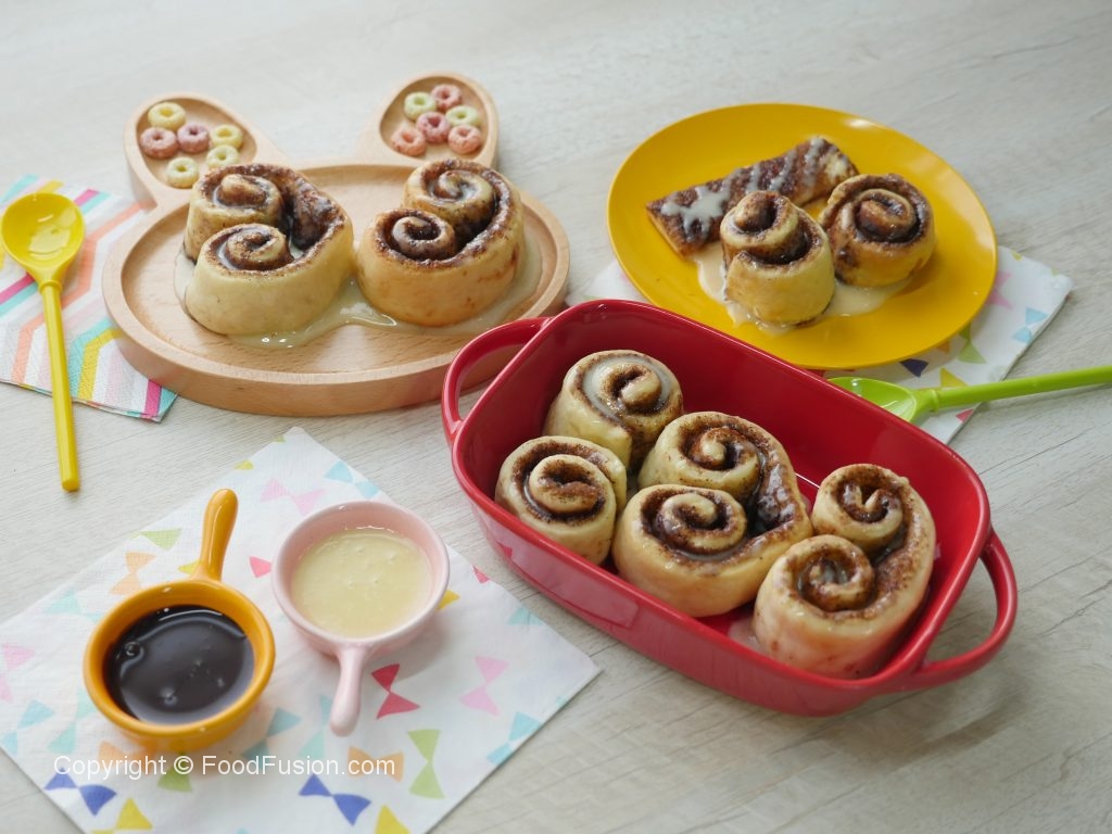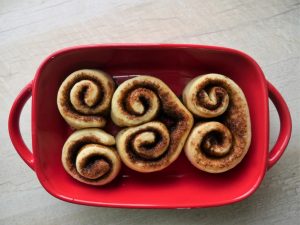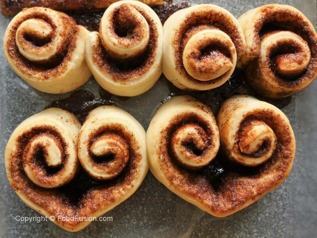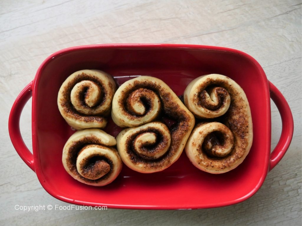 On baking tray (9x13”),lined with butter paper & grease with oil,place cinnamon rolls,cover and allow to rise for further 30-40 minutes or until doubled in size.