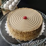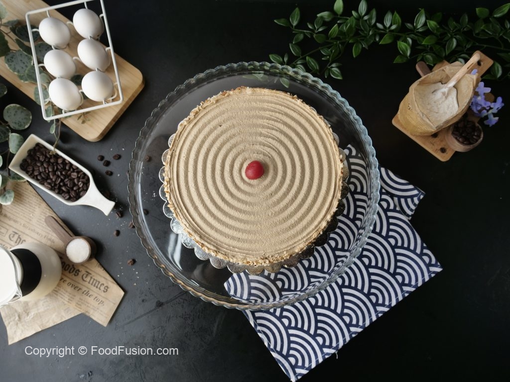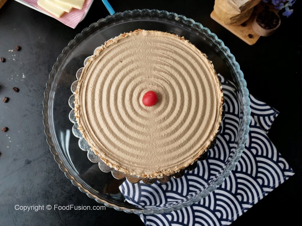 Cake stand per cake ki first layer rakh dein,coffee syrup aur coffee butter frosting dal ker pheela lein,badam dal dein aur cake ki top layer rakh dein.