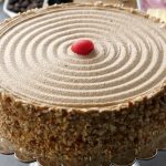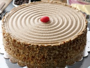 Place first layer of cake on a cake stand,add coffee syrup,add & spread coffee butter frosting,almonds and place top layer of cake over it.