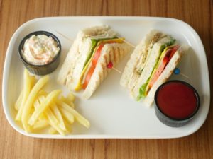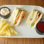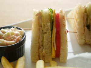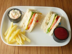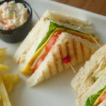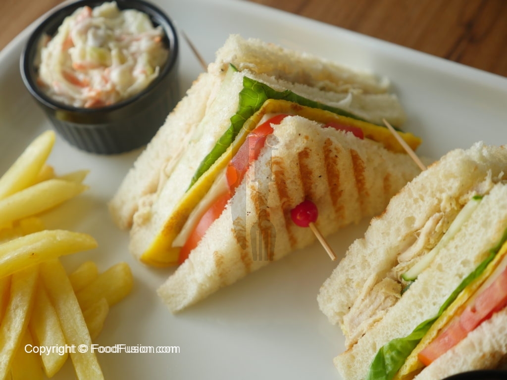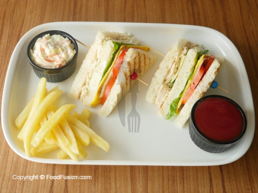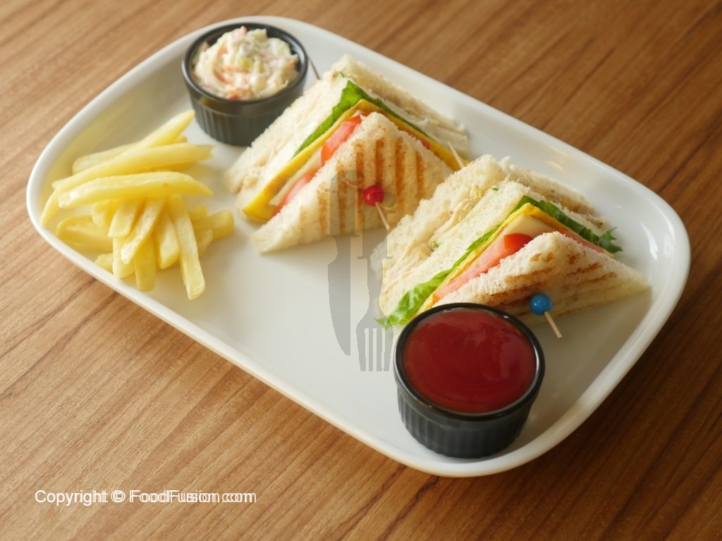 Clun sandwich is ready,serve with french fries,coleslaw and ketchup.