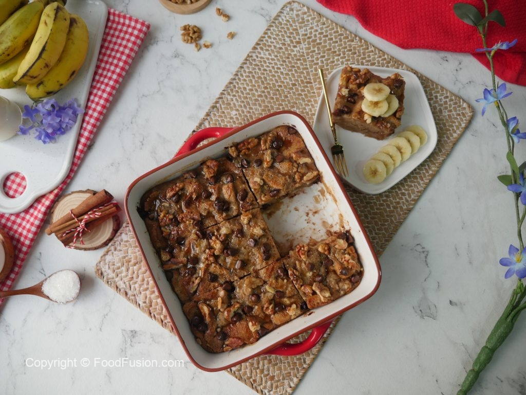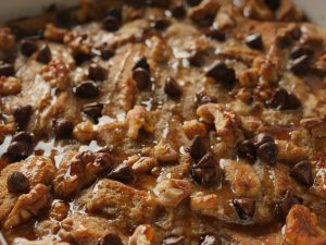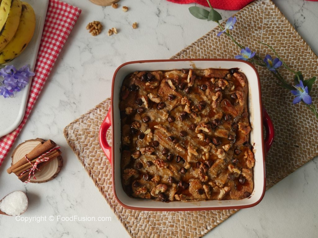 Now add bread cubes,chocolate chips,walnuts & mix well.