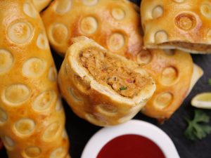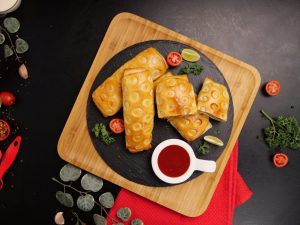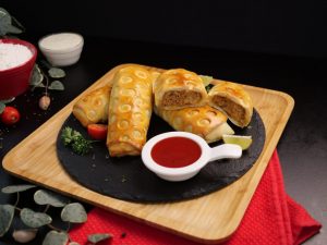 -Add 2 tbs of prepared chicken filling on rolled dough & roll it till half.