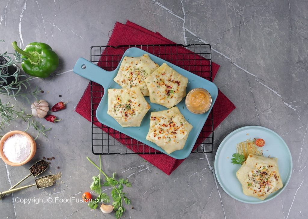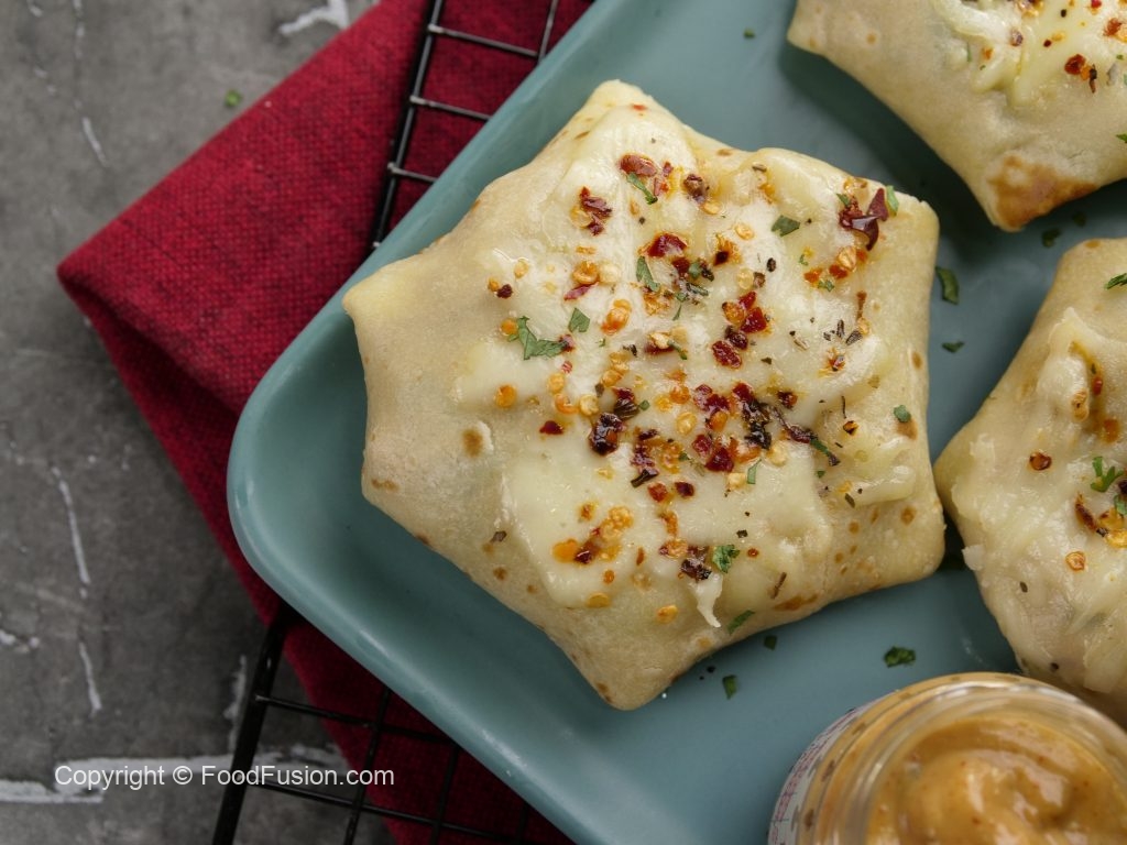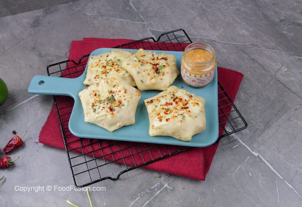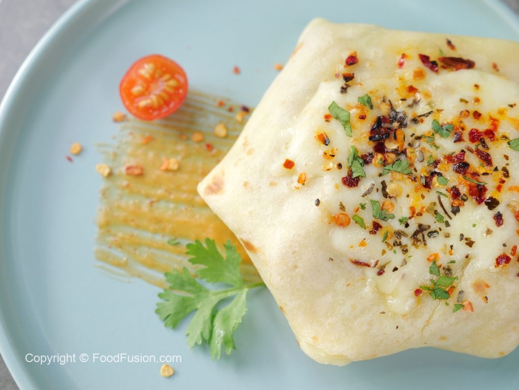 -Grease griddle with cooking oil,place stuffed crepes,sprinkle dried oregano,red chilli crushed,cover & cook on low flame until cheese melts (1-2 minutes).