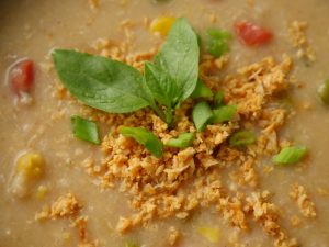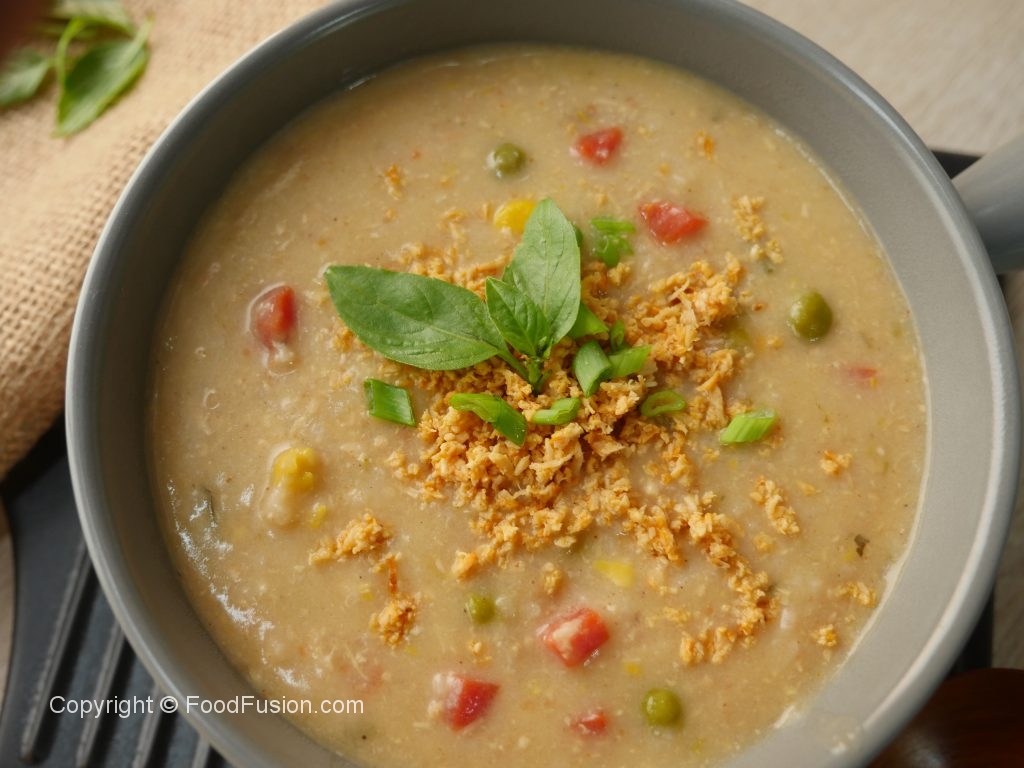 Hara pyaz aur basil leaves sa garnish ker ka serve karein.