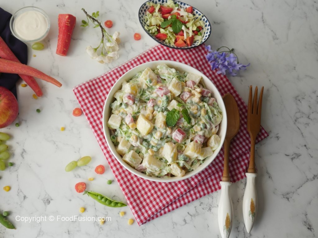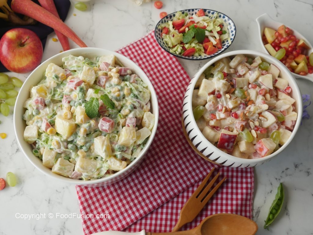 In a bowl,add cream,mayonnaise,caster sugar,black pepper crushed,salt & whisk well to combine.