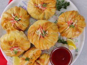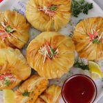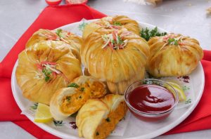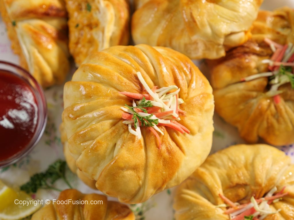 -Place prepared creamy tikka filling (2-3 tbs) in the center of rolled dough,add green chilli,fresh coriander then pull & wrap the remaining part of dough than twist it slightly & spread the frill of dough on the dough ball.