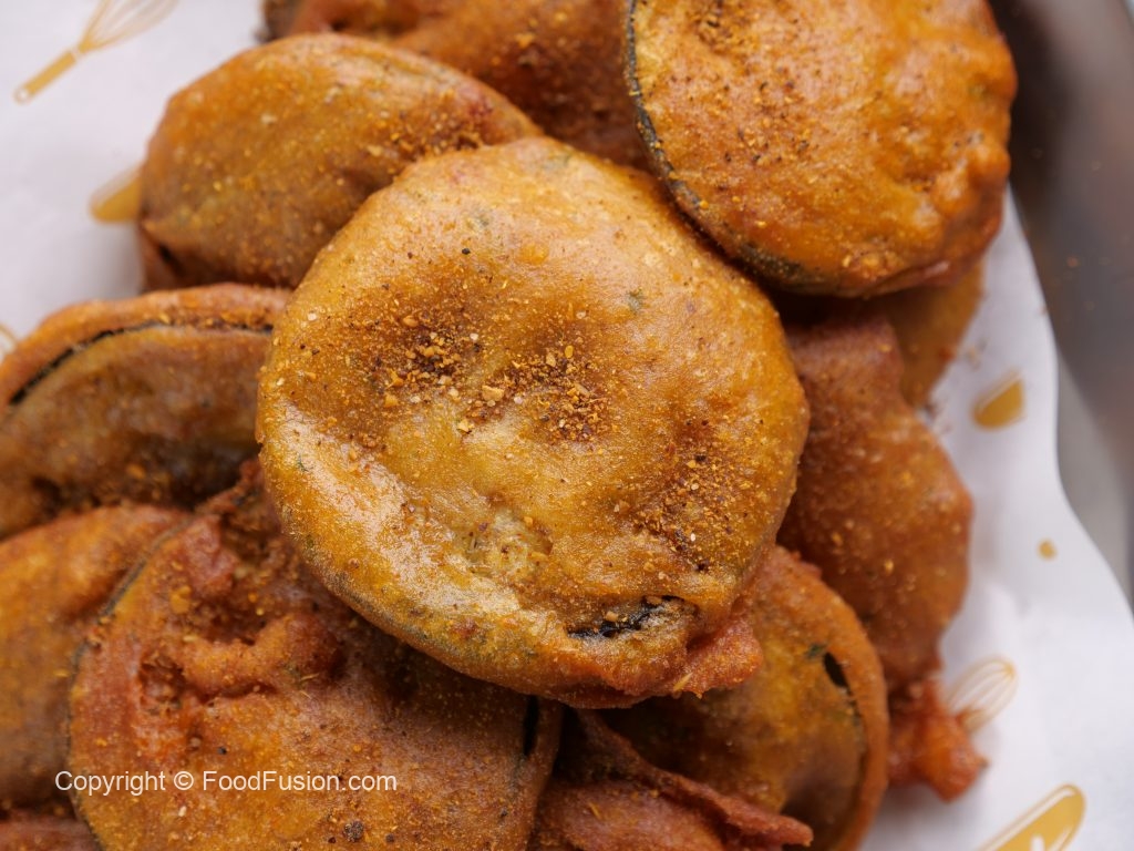 -In a wok,heat cooking oil,dip eggplant slices in pakora batter & fry on low flame until golden.