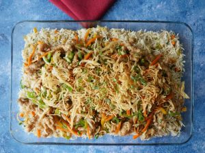 In serving dish,add fried rice,crispy fried chicken with vegetables,fried egg noodles (crush with your hand), green onion leaves & serve!