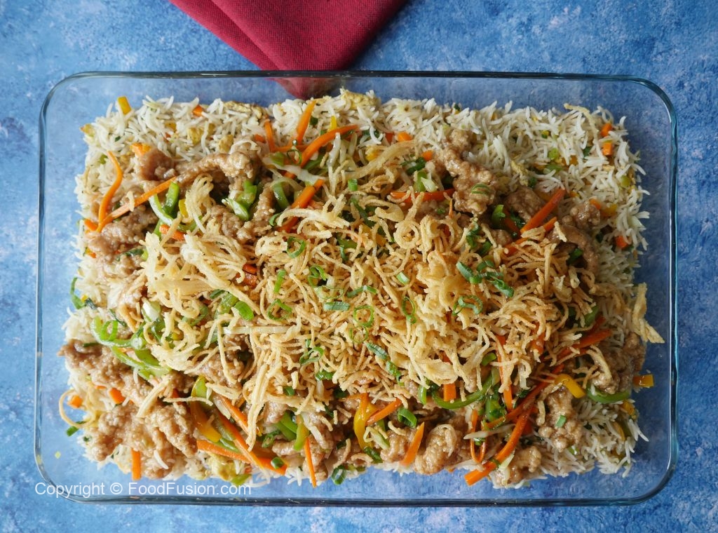 Serving dish mein fried rice,crispy fried chicken with vegetables aur fried egg noodles,hara pyaz ka leaves dal ker serve karein.
