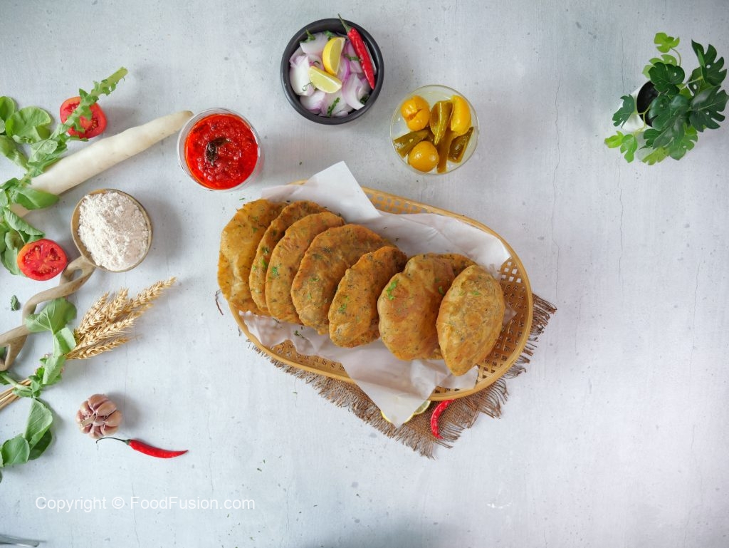 -Dry flour se dust kar ke, rolling pin ki madad se roll karen aur 5 inches ki puri bana lein. (13–14 puriyan banti hain)