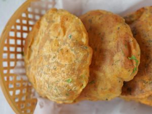 -In a wok, add cooking oil, heat it, add prepared puri, fry on medium flame until golden.