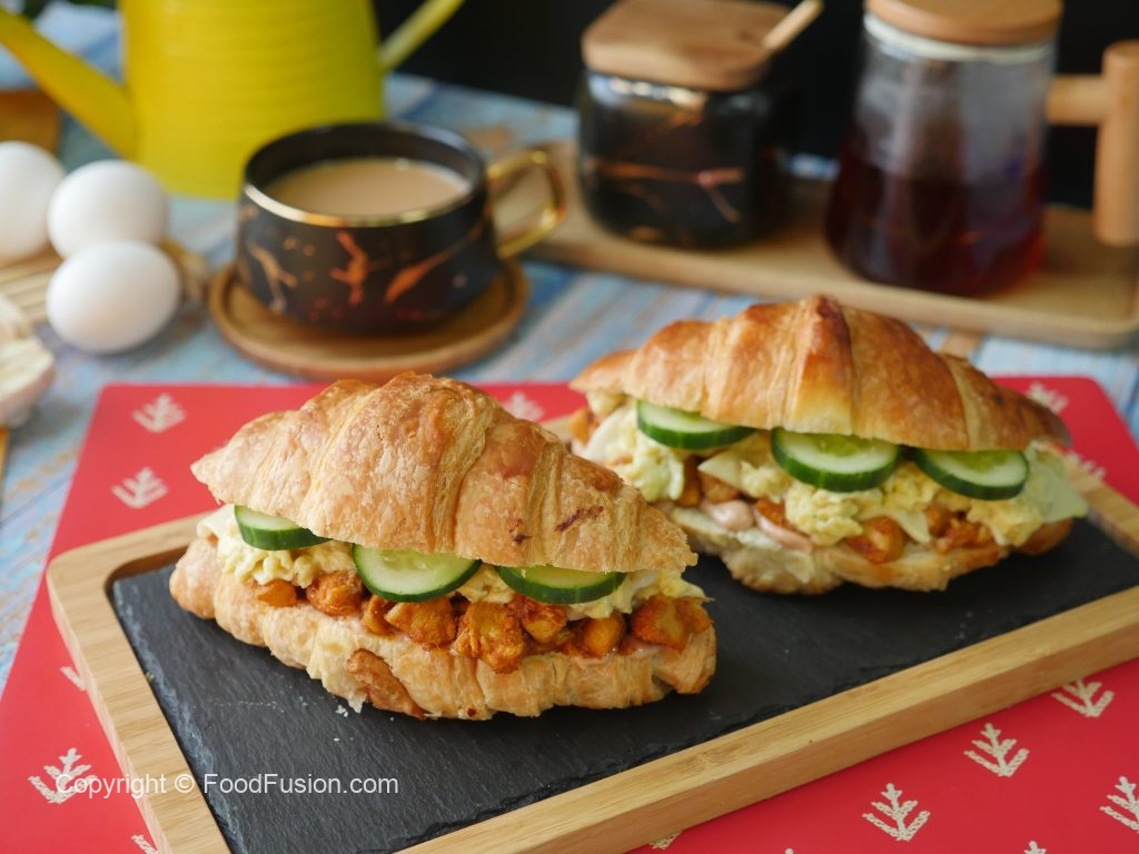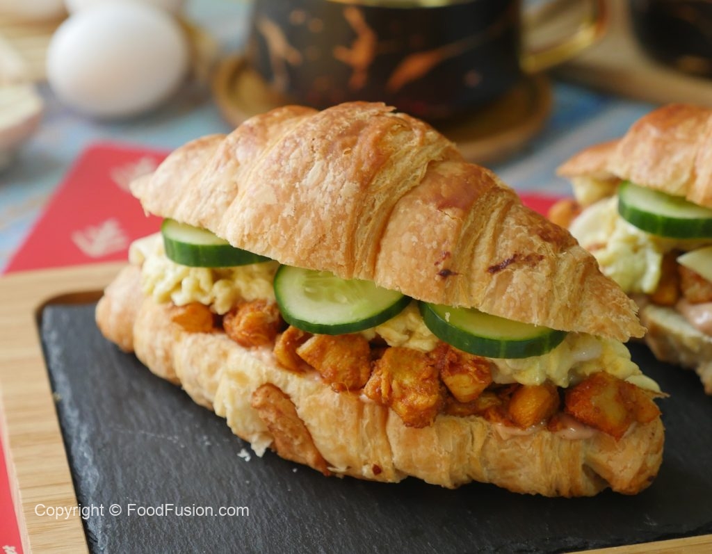 Add prepared mayo sauce,chicken tikka cubes,cheese slices,prepared scrambled eggs,cucumber slices & croissant on top (makes 3-4).