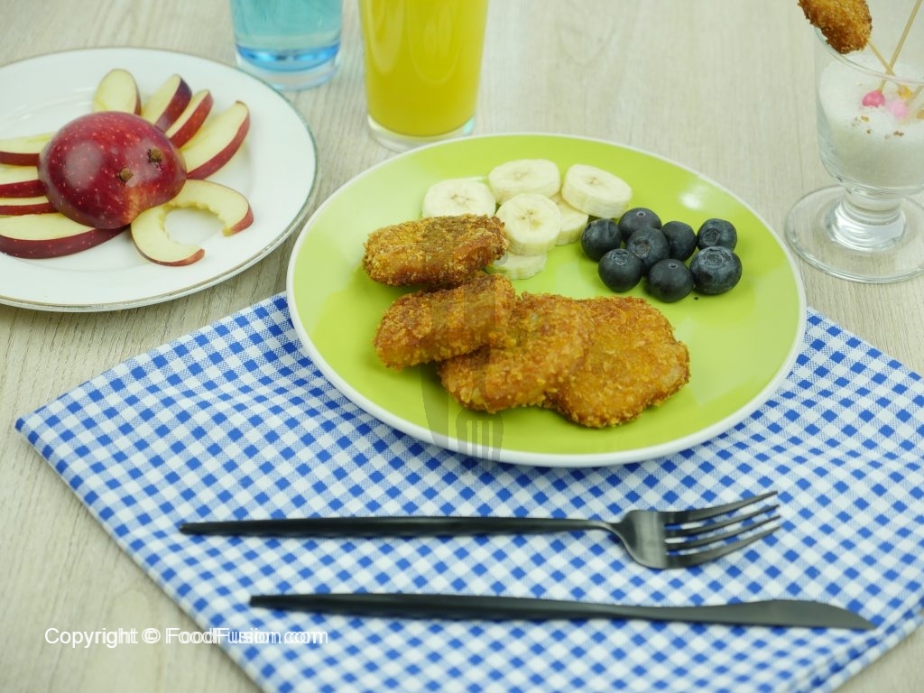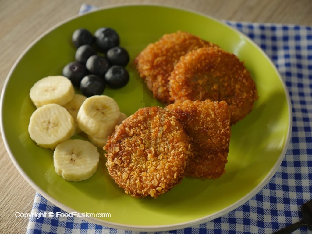 Now dip bread slices into beaten egg then coat in corn flakes.