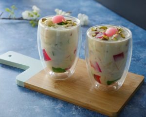 In serving glass,add red jelly cubes,green jelly cubes,doodh dulari and garnish with pink gulab jaman, pistachios & serve!