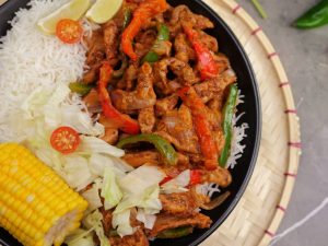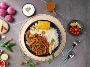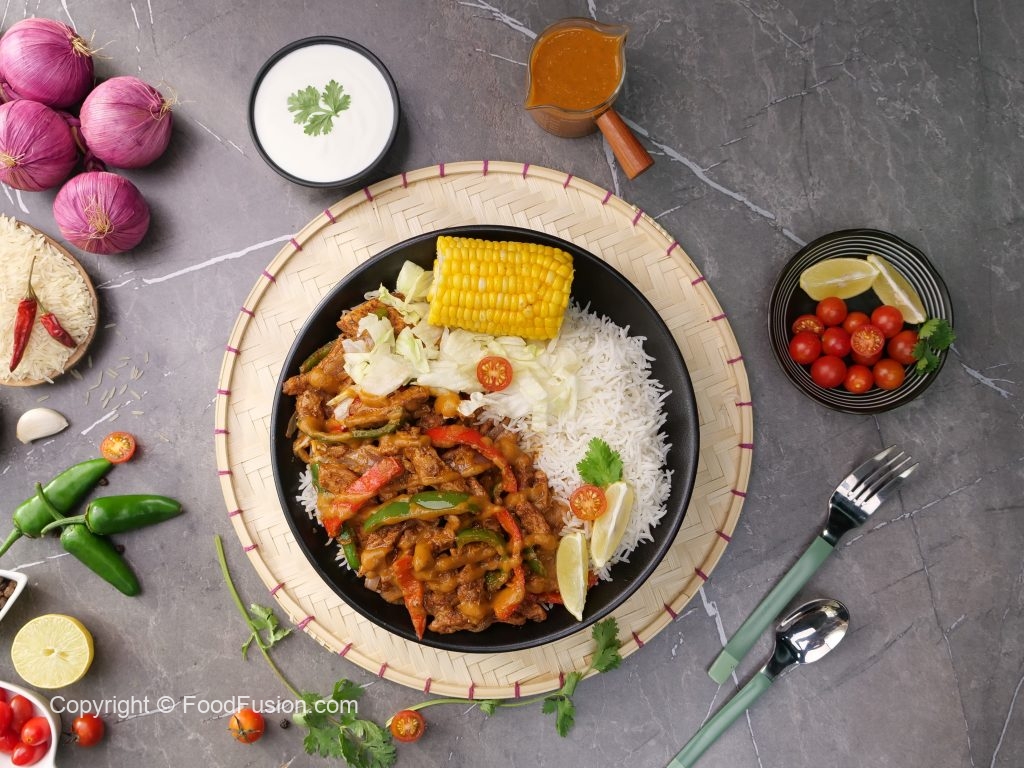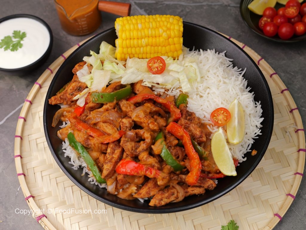-Serving bowl mein boiled rice,tayyar fajita chicken,tayyar tomato sauce,iceberg,corn cob,lemon wedges & cherry tomato ka saath serve karein!