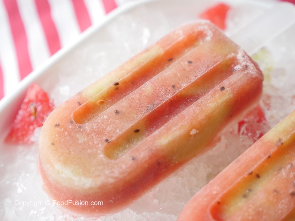 Ice pop molds mein kiwi slices rakh ker tayyar puree dal dein aur kiwi slices rakh dein aur solid hunay tak freeze ker lein (8 hours).