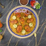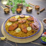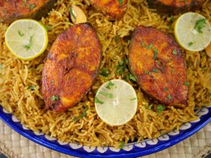 -In a serving platter, add mandi rice, baked fish, garnish with lemon slices, give a coal smoke & serve with prepared mandi sauce & salad!