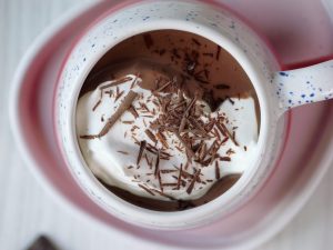 -In serving cup,add hot chocolate,whipped cream & sprinkle chocolate shavings & serve!