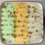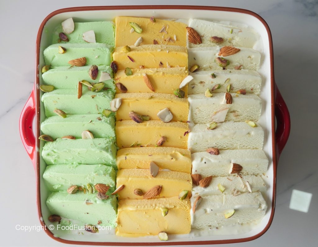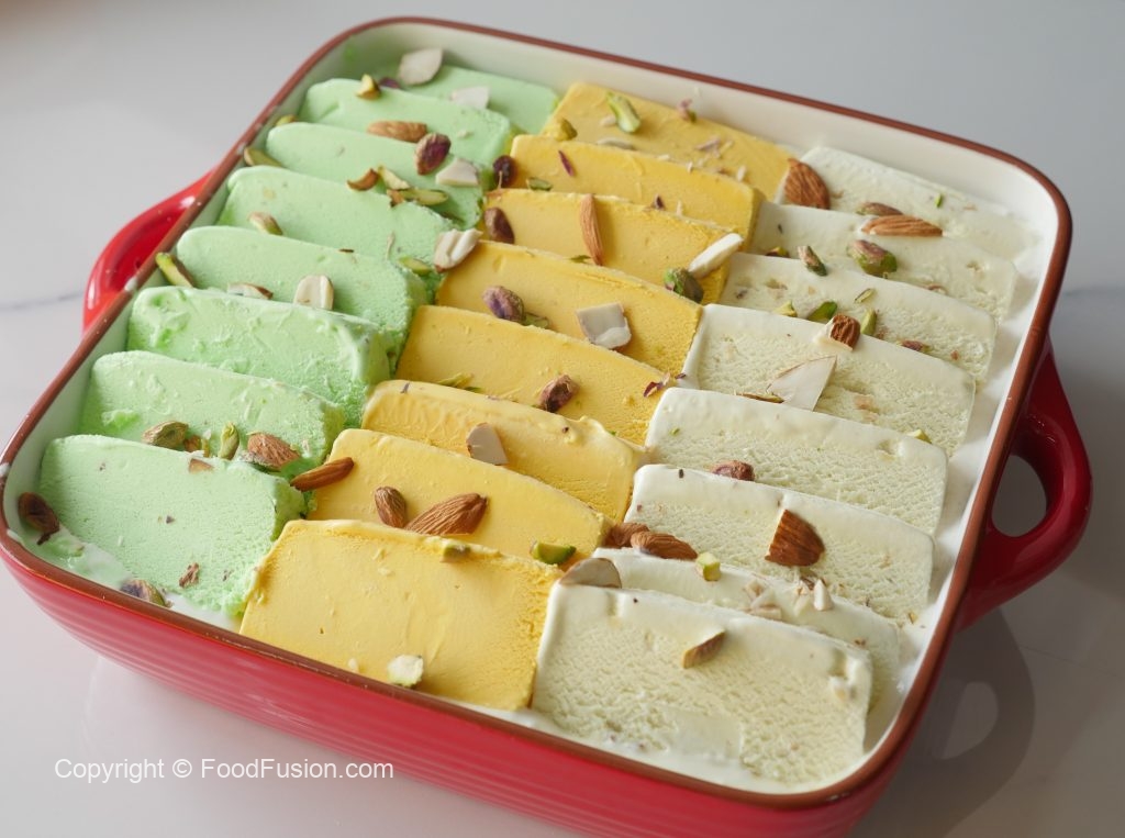 Add slices of king kulfa,mango and pista ice cream and garnish with almonds & pistachios & serve!